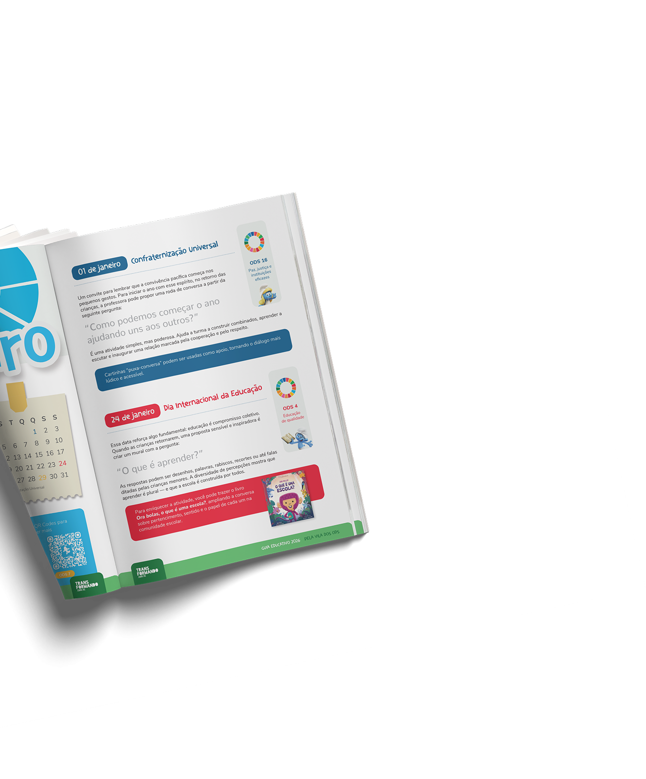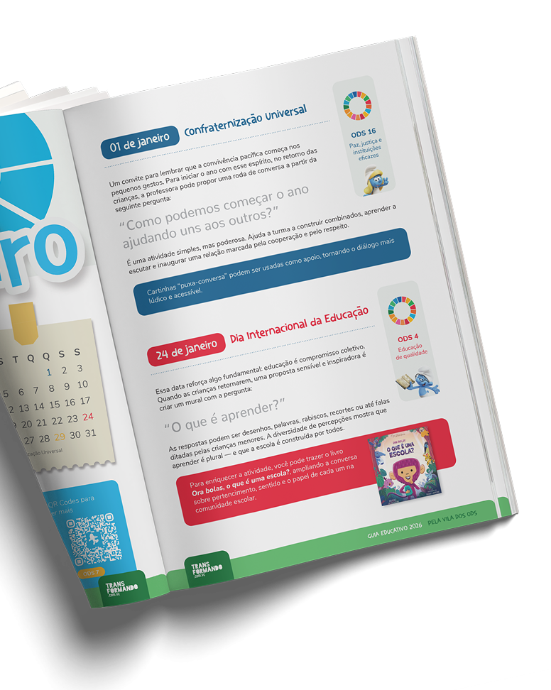 Ao longo de cada mês, o guia propõe atividades pedagógicas alinhadas aos 17 Objetivos de Desenvolvimento Sustentável, além das Cápsulas do Vínculo que Transforma — uma seção especial dedicada ao fortalecimento da conexão humana e à interação entre escola e família.