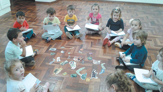 Sentamos com os alunos em uma rodinha e espalhamos vários animais no centro. As professoras foram os apresentando e explicando sobre a alimentação e o habitat natural de cada um deles. O animal que mais chamou a atenção das crianças foi a vaquinha, com a qual interagiram e puderam se envolver nessa atividade.