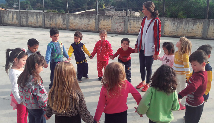 Brincadeiras em sala de aula, pátio escolar, parquinho, casa de areia e praça. Brincadeiras em outras escolas para interação das crianças. Brincadeiras com a vovó. Oficinas de brinquedos recicláveis na instituição, com auxílio dos pais na coleta do material.