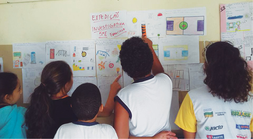 Na própria escola. Foi realizado com os alunos um passeio nos diversos espaços escolares e em seus arredores, levando-os a observaram tudo que há na escola que lembra matemática.