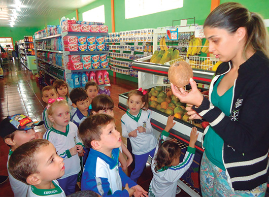 Foi realizada a visita ao Mercado Jotaesse; História na sala: ginástica historiada (A Cesta de Dona Maricota); Seleção das frutas, cores, formas e tamanhos; Higienização das frutas; Higiene dos alunos para a construção dos espetinhos de frutas; Degustação das frutas.
