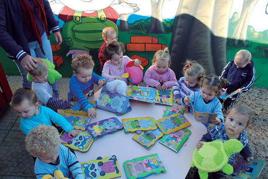 Famílias – confecção de cartilhas pelas crianças com a ajuda da família; Visita do animalzinho de pelúcia para casa, passando o final de semana, brincando e se divertindo. Doação de livros para as crianças – CMDCA.