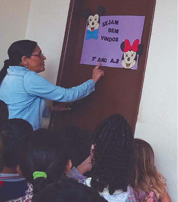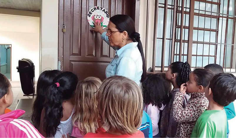 A expedição investigativa foi realizada na escola, por meio de símbolos fixados em vários locais da instituição (banheiro, biblioteca, salas de aulas, pátio, cozinha, sala dos professores e diretoria) para que as crianças identificassem os símbolos existentes na escola.