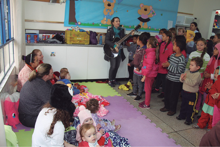 Visita do Coral Infantil Projeto Viver em nosso CMEI; Participação musical da Professora Ursale Henchel, interação com as crianças no CMEI; Famílias envolvidas nas atividades pedagógicas e envio de uma música que eles cantavam na sua infância.