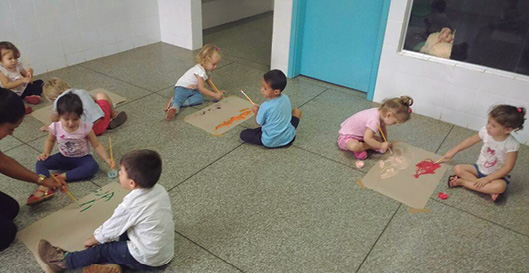 Fizemos passeios onde observamos as cores dos carros, casas, etc. Ao longo da caminhada interrogamos as crianças quanto às cores que reconheciam. Realizamos atividades de pintura, onde cada criança recebia uma cor para pintar. Fizemos também uma atividade em conjunto com os pais. Cada criança levou para casa uma folha que continha o desenho de uma casa, e com a ajuda dos pais pintaram o desenho de acordo com a cor de sua casa. Ao final faremos uma exposição dos desenhos para que as crianças reconheçam a cor das suas casas e das casas dos colegas.