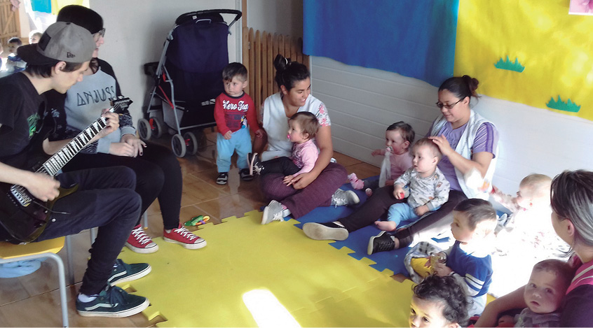 Atividades relacionadas a músicas enviadas para a família, com o objetivo de aumentar a relação entre pais e filhos.Visita dos músicos Suellen e Misael para mostrar os instrumentos aos alunos e realizar a hora da música.