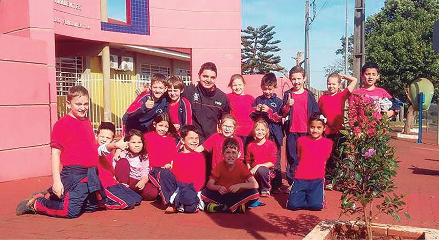 Palestra com os Gestores Ambientais Maira Hermann e André Backes, que destacaram a importância das árvores no ecossistema, algumas características, suas funções, preservação, cuidado e plantio adequado de árvores para sombreamento. Plantio de árvores de sombra em espaços estratégicos da escola com a participação dos alunos, professor e Gestores Ambientais. Com destaque que os espaços escolhidos servirão para sombra principalmente em momentos da prática do brincar, os alunos se responsabilizaram em cuidar das mesmas.