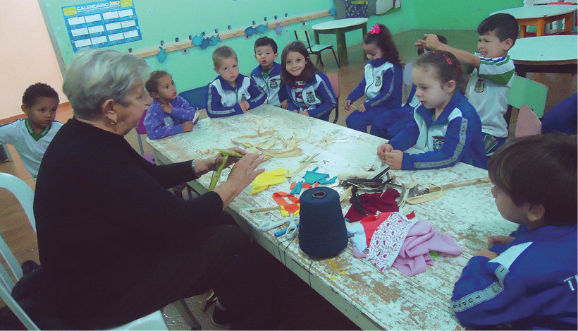 Visita de uma pessoa da comunidade, os alunos realizaram uma entrevista e a mesma relatou brincadeiras antigas e confeccionou alguns brinquedos. Na sequência, foi realizada uma roda de conversa com os alunos para definir o nome do projeto. Após a conversa com uma pessoa da comunidade, foi realizada a coleta de materiais para oficina. Na sequência, os alunos realizaram junto com a pessoa da comunidade e a professora a confecção de alguns brinquedos. Também foram realizadas algumas brincadeiras como corrida do saco, corrida do pano, confecção de pipa.