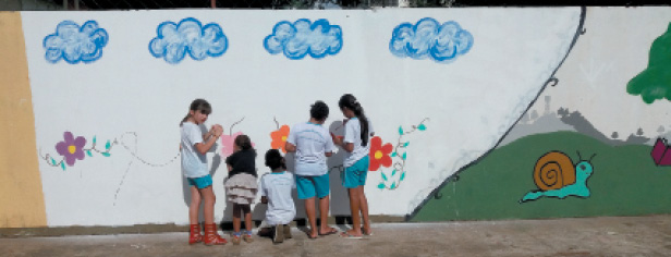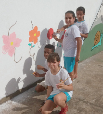 Realizamos as pesquisas na internet para conhecer, por meio de fotos e contatos, outras escolas que realizaram pinturas em seu muro, para construir o novo visual da nossa escola.