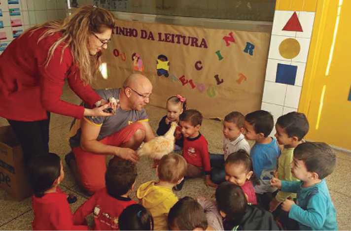 Para realizar a comunidade de aprendizagem, convidamos o Senhor Rosivaldo dos Santos Romeiro para trazer até a escola uma galinha, já que a galinha foi o animal mais comentado pelas crianças. O senhor Rosivaldo trouxe um ovo, uma galinha e dois pintinhos e explicou de forma objetiva sobre a vida delas, o que elas comem, onde dormem, como se reproduzem. As crianças ficaram entusiasmadas e muito curiosas com a experiência, foi muito divertido.