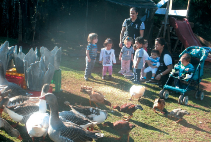 A expedição investigativa foi realizada em uma pequena chácara perto do CMEI, onde as crianças tiveram contato com os animais, podendo até alimentá-los.