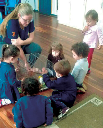 Recebemos a visita do professor Valtenci Tosta das Neves, acompanhado dos pintinhos que cria em sua casa. Luciana Zoccoli Cardoso da Silva, contadora de histórias e professora de música, cantou com as crianças a ciranda dos bichos. Ione e Leandro Hemsing, agricultores e pecuaristas, vieram contar suas experiências com animais para as crianças.