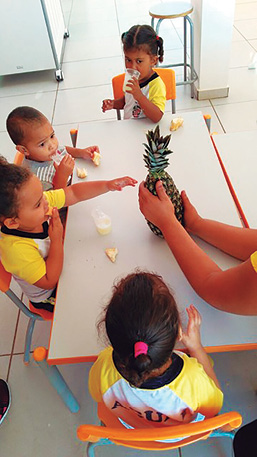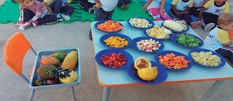 Matemática: utilização da contagem oral, manipulação e exploração de frutas e brinquedos em situações organizadas como: pareamento de cores, quantidades, formas geométricas, classificação, agrupamento, desenvolver noções de conceitos básicos; Natureza e Sociedade: perceber a importância da alimentação saudável e da higienização dos alimentos; Linguagem Oral e Escrita: atividades que envolvam histórias, brincadeiras, canções, manuseio de materiais impressos, participação em rodas de conversa relatando suas vivências.