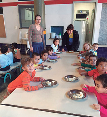 Degustação de doce de leite feita pela merendeira da escola Adriana. Cozinheiras e nutricionistas: culinária, arroz doce.