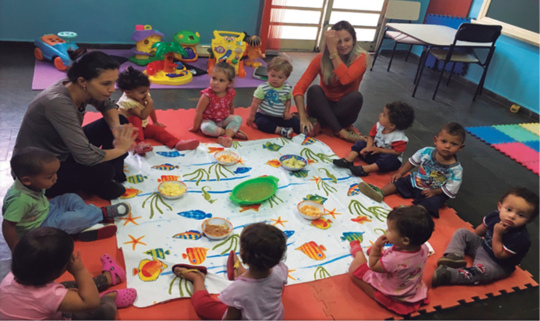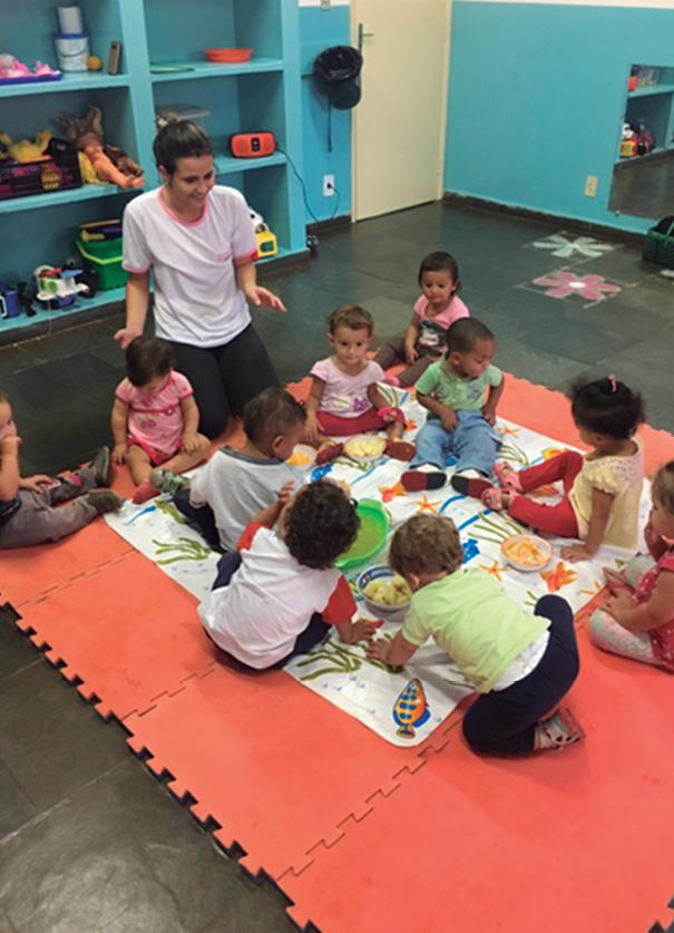 Em sala preparamos o ambiente para a exploração com toalha colorida e expusemos os alimentos separados em tigelas, classificados como: salgado, doce e azedo. Colocamos as crianças em volta da toalha e apresentamos os alimentos pelo nome e cantamos a música do lanchinho. Conversamos com eles, mostrando que poderiam comer, deixando que cada um se servisse e explorasse os sabores e cores dos alimentos.
