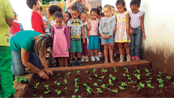 Expedição investigativa na horta da Dona Regina. Plantio e cultivo de uma horta pelas crianças e pais. Visita ao ferro velho São José. Passeio na praça municipal. Acordo com os pais para que estimulem as crianças a reciclar materiais em suas casas e na escola. Palestra sobre a importância do óleo reutilizado e confecção do sabão ecológico pelos pais e professores.