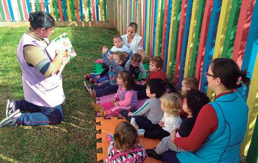 Historinhas contadas por mãe, avó de aluno e também pela bibliotecária. Envio de sacolinha de leitura com livros infantis para os pais poderem ler com seus filhos em casa. Visita à brinquedoteca.
