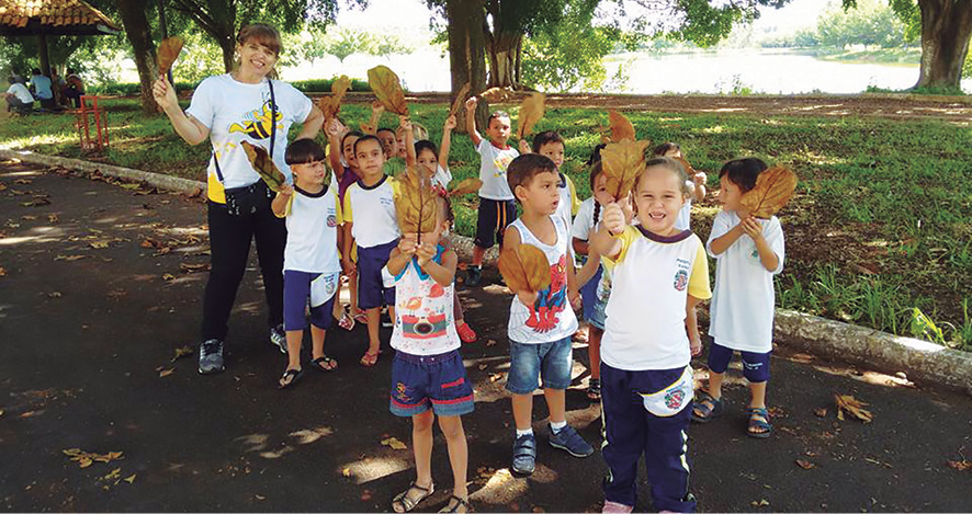 Ciências: observação e coleta de folhas caídas no chão, textura, tamanho, função das folhas nas plantas, importância das folhas comestíveis para o organismo; Sociedade: início do outono (porque as folhas caem); Português: lista de nomes de árvores a partir das folhas coletadas, escrita de frases, produção de texto coletivo tendo como base a expedição investigativa; Matemática: contagem, situações-problema e sequência-lógica; Arte: produção livre da expedição e produção de efeitos com folhas.