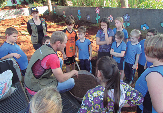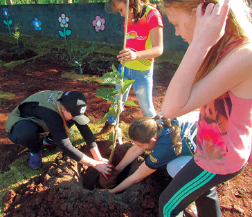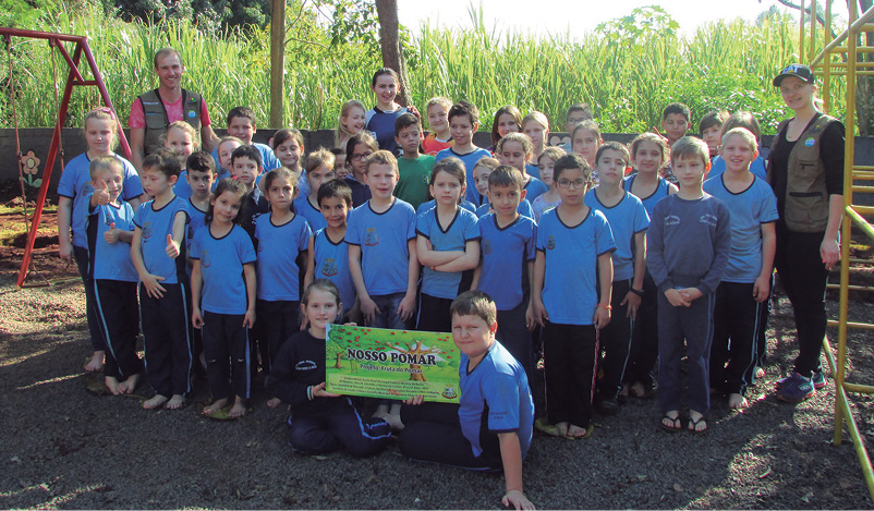 Palestra com gestores ambientais Maira Hermann e André Backes, apresentando os benefícios das plantas para todo o meio ambiente e para os seres humanos. Palestra com nutricionista Maira Hermann sobre os pontos positivos de ter árvores frutíferas e uma alimentação saudável através das frutas. Plantio de mudas de árvores frutíferas no pátio da escola construindo um pomar na escola.