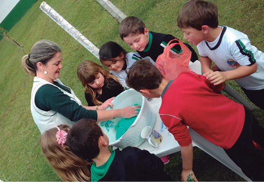 Os alunos e a professora participaram da realização da atividade, auxiliando uns aos outros para chegarem ao objetivo final.