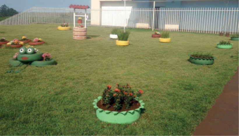 A expedição foi realizada no jardim da escola. Após observação, perceberam que o ambiente precisava de mais cor e para isso decidiram elaborar um jardim reaproveitando pneus velhos.