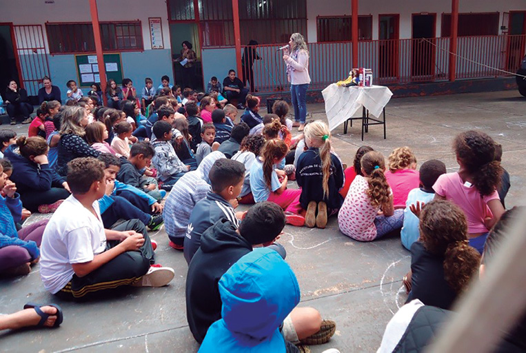Foi convidada a contadora de histórias Aline Perrota, assessora da SME, para vir ao pátio da escola contar o conto “A Bela e a Fera”Roda de debates com a contadora Aline para compararem as várias versões do conto e seus sentimentos.