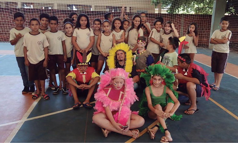 Apresentação de músicas tocadas com flauta pelos alunos do Projeto Piá, acompanhados pelo professor Jonas Silva Paes, caracterizados de índios no Dia do Índio.
