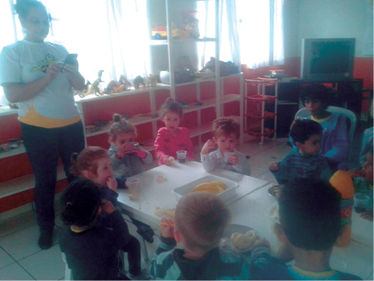 A expedição investigativa aconteceu na Brinquedoteca Municipal. Fizemos um piquenique colaborativo, as crianças sentaram-se e colocaram na mesa os alimentos que trouxeram para a atividade. Explicamos a importância de cada alimento, estimulando-os a comerem um pouco de cada um.