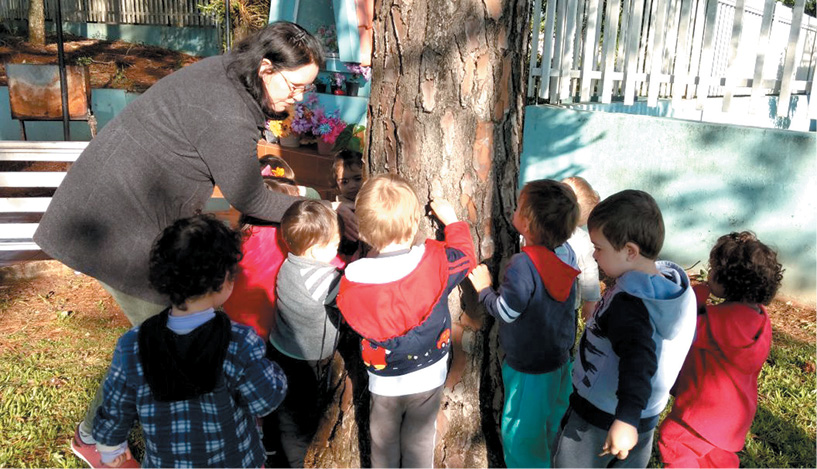 A expedição investigativa aconteceu após observarmos os alunos em um passeio na gruta da igreja matriz. Nela, as crianças brincaram e encontraram uma casca de árvore. Ficaram intrigados com sua textura áspera, passavam de um para o outro para que todos conseguissem senti-la.