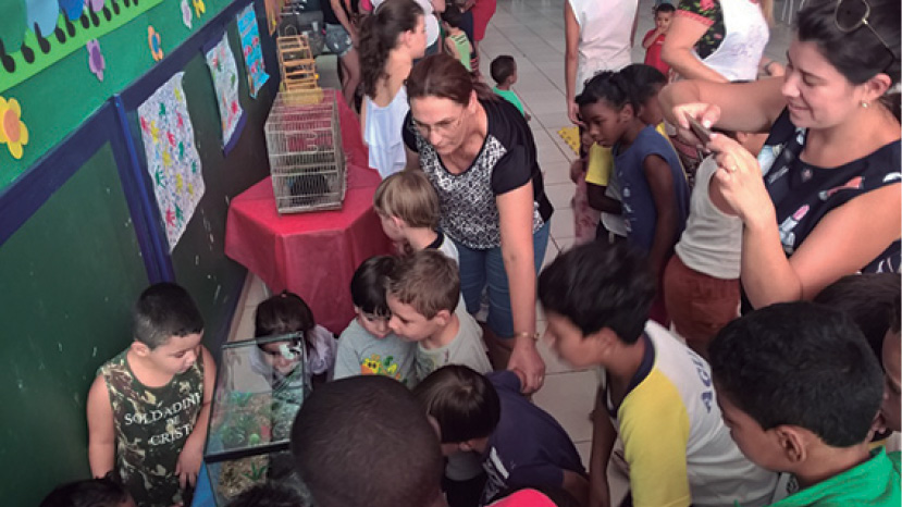 Recebemos um veterinário, famílias e apoiadores que trouxeram os animais para a escola para o contato com as crianças.