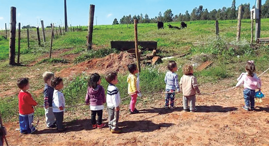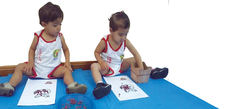 Português: linguagem oral, histórias, figuras ilustrativas e musicas; Matemática: formas geométricas, quantidades, tamanho e lateralidade; Natureza e sociedade: manifestações culturais, tradições; Artes visuais: pinturas com tinta guache, colagem, massinha; Movimento: musicalização dança