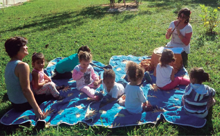 Nossa expedição foi realizada no gramado da escola. Recebemos a visita de uma contadora de histórias e musicista. O som doce e delicado de sua flauta encheu a escola de uma vitalidade única. Os bebês foram como que encantados por aquela voz e aquela música. Ali, um interesse genuíno por este modo outro de fazer música nasceu.