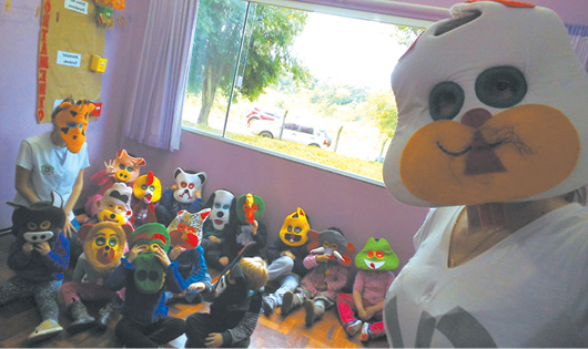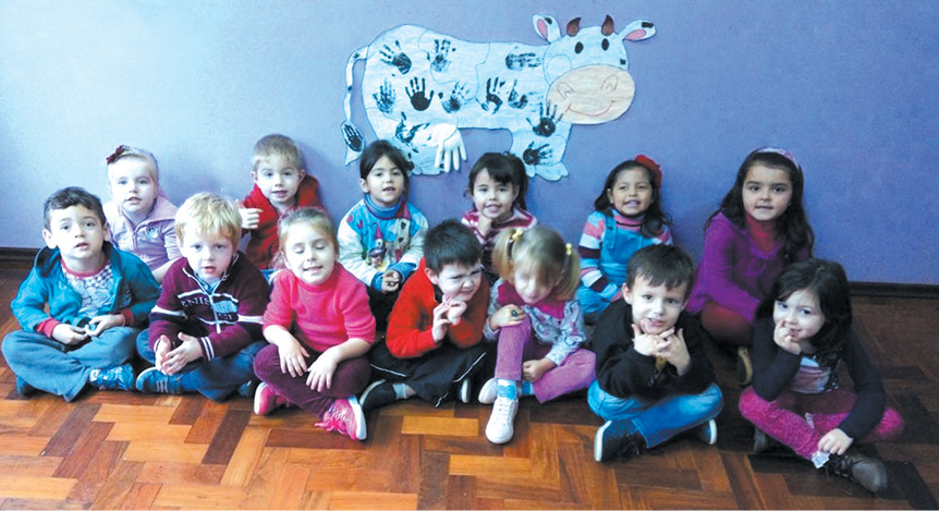 Em conjunto com as crianças, colorimos a vaca, depois enchemos a luva com guache e água para fazer de conta que era o leite e, em seguida, os alunos puderam tirar o leite.