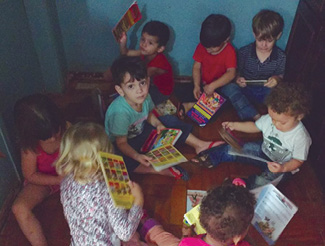 A expedição investigativa foi realizada na sala de aula, onde foram montados quatro ambientes, com brinquedos, produtos de higiene, figuras geométricas e livros de literatura infantil.