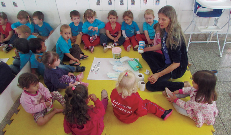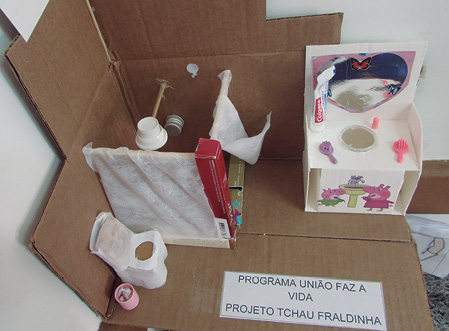 Primeiramente foi realizado um momento de conversa com as crianças com enfoque na importância de “não usar fralda” para seu conforto. As crianças foram levadas ao banheiro para observar outras crianças no vaso, pois uma criança adora imitar as outras. O próximo passo foi a construção de um banheiro com caixas de leite. Foi feito então um cartaz com uma fralda de cada criança que faz “xixi” e “cocô” no banheiro, incentivando assim cada dia mais as crianças a colocarem sua fralda no cartaz.