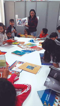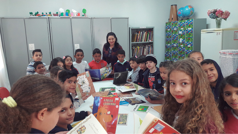 Visita à biblioteca com a bibliotecária. Campanha para a arrecadação de livros para a biblioteca da escola realizada pela SICREDI.